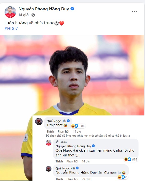 Thông điệp của cầu thủ quê Bình Phước nhận được phản ứng tích cực của các đồng đội và người hâm mộ. Đáng chú ý, trung vệ Quế Ngọc Hải đã không ngại gửi 'chiến thư' tới người đàn em. Đáp lại lời thách thức từ người đàn anh, Hồng Duy cũng tự tin tuyên bố: "Hẹn mùng 6 nhá, rồi cho anh lên thớt".