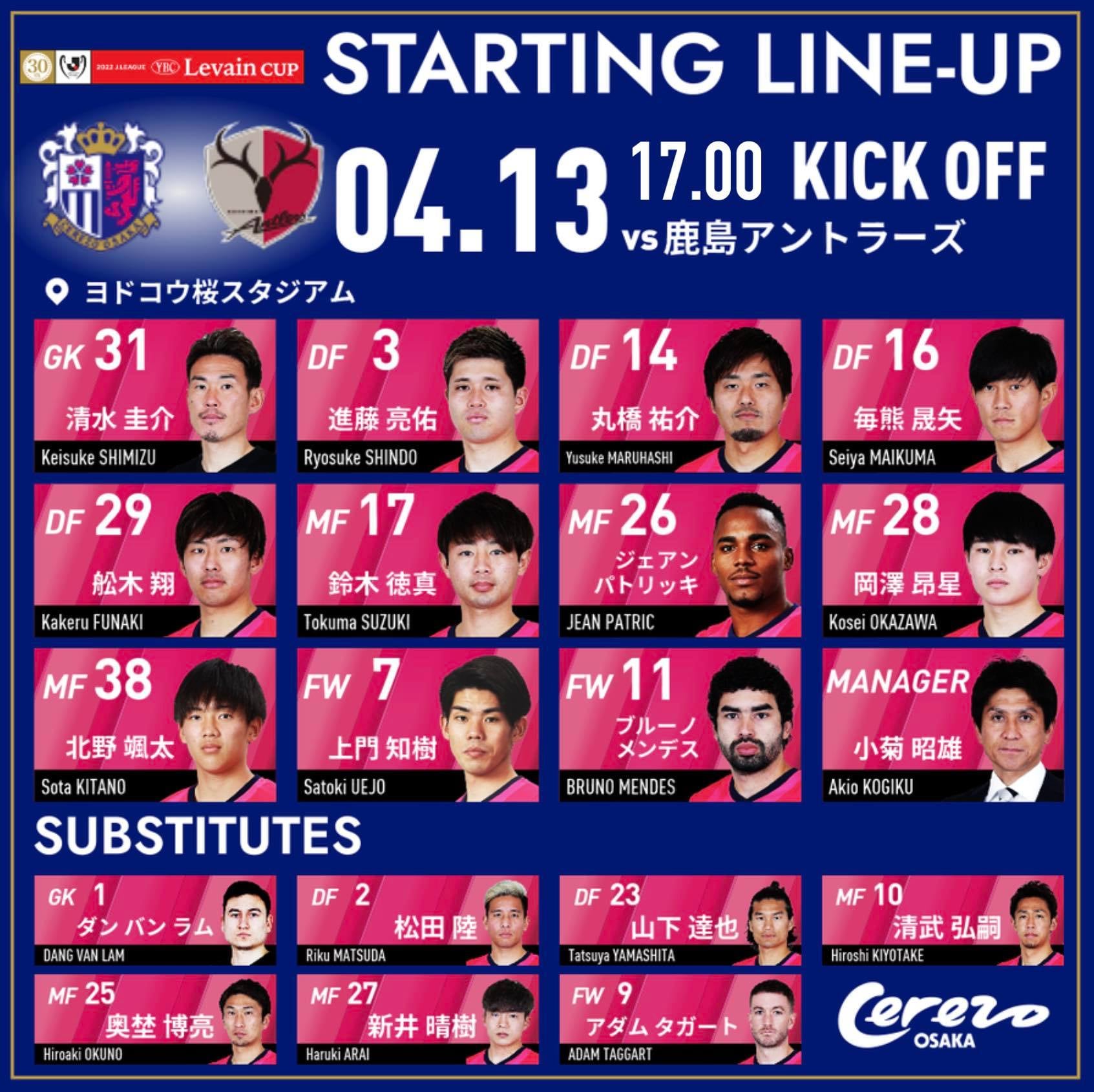 Chiều ngày 13/3, Cerezo Osaka có trận đấu gặp Kashima Antlers trong khuôn khổ lượt trận thứ 4 bảng A Cúp Liên đoàn Nhật Bản. Sau 3 lượt trận đầu tiên, Cerezo Osaka đang là đội dẫn đầu với 9 điểm tuyệt đối, hơn chính đối thủ Kashima Antlers tới 5 điểm. Đáng tiếc, đội bóng của Đặng Văn Lâm đã để thua ở trận đấu vừa qua và để Kashima Antlers rút ngắn khoảng cách xuống còn 2 điểm.