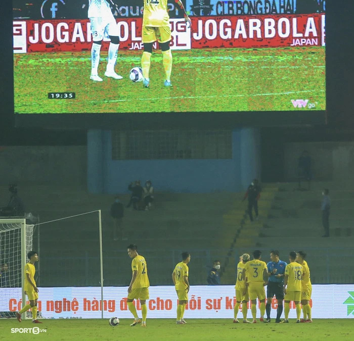 Tình huống trọng tài Trần Đình Thịnh xem lại pha bóng qua màn hình lớn ở sân Lạch Tray (Ảnh: Sport5)