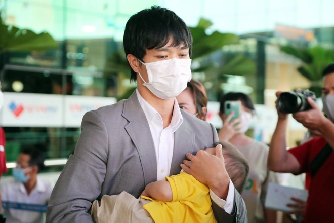 Công Phượng bế con trai khi đáp chuyến bay về tới TP.HCM.