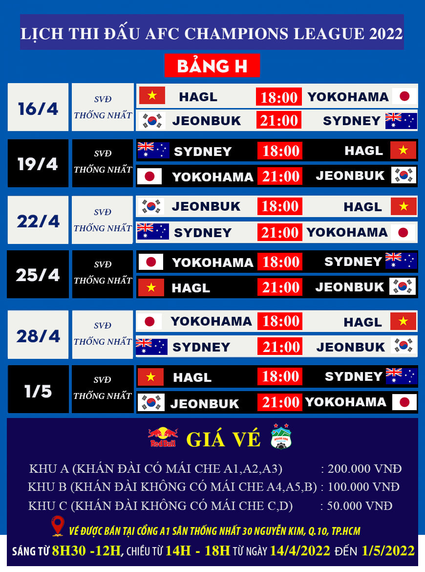 Mới đây, CLB HAGL đã chính thức công bố lịch thi đấu cũng như giá vé của các trận đấu tại bảng H AFC Champions League. Tất cả các trận đấu sẽ được tổ chức trên SVĐ Thống Nhất. Cụ thể, giá vé như sau: