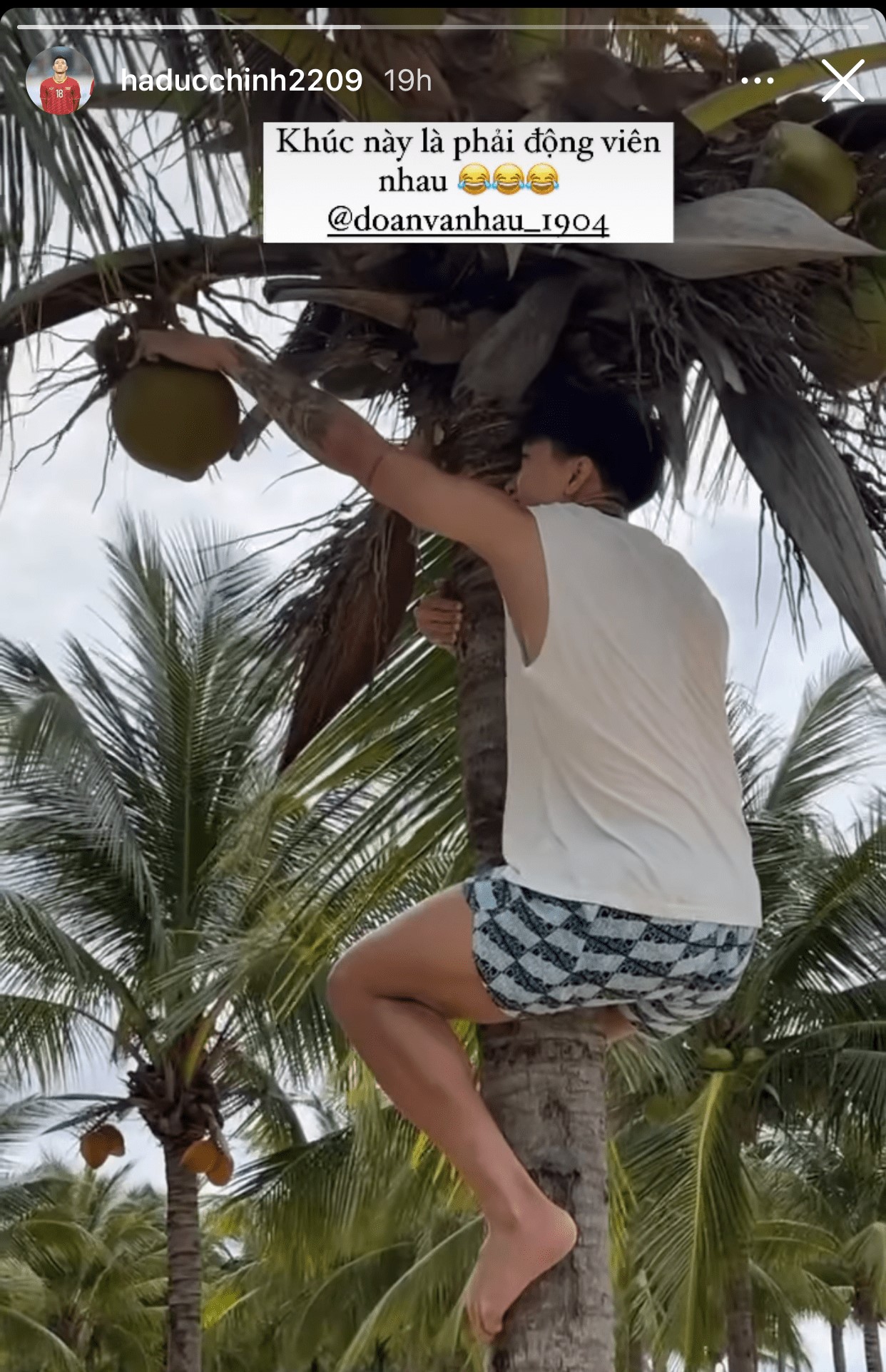 Trên trang cá nhân của mình, tiền đạo của CLB Bình Định đã đăng tải hình ảnh Đoàn Văn Hậu đang cố gắng hái dừa. Hà Đức Chinh hài hước chia sẻ "Khúc này là phải động viên nhau".