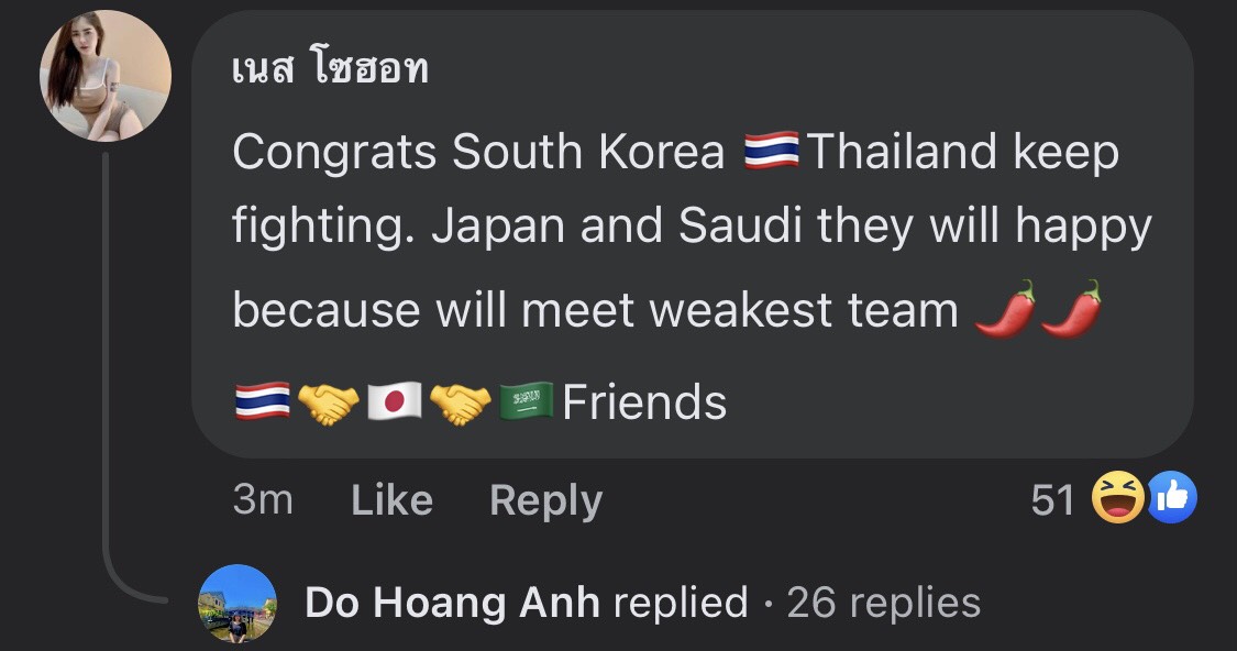 Chứng kiến U23 Việt Nam giành vé đi tiếp, người hâm mộ Thái Lan đã có rất nhiều bình luận tiêu cực. Cụ thể, người hâm mộ xứ chùa Vàng cho rằng U23 Việt Nam đã may mắn có được chiến thắng trước U23 Malaysia nhờ tấm thẻ đỏ trong hiệp 1 mà Malaysia phải nhận.