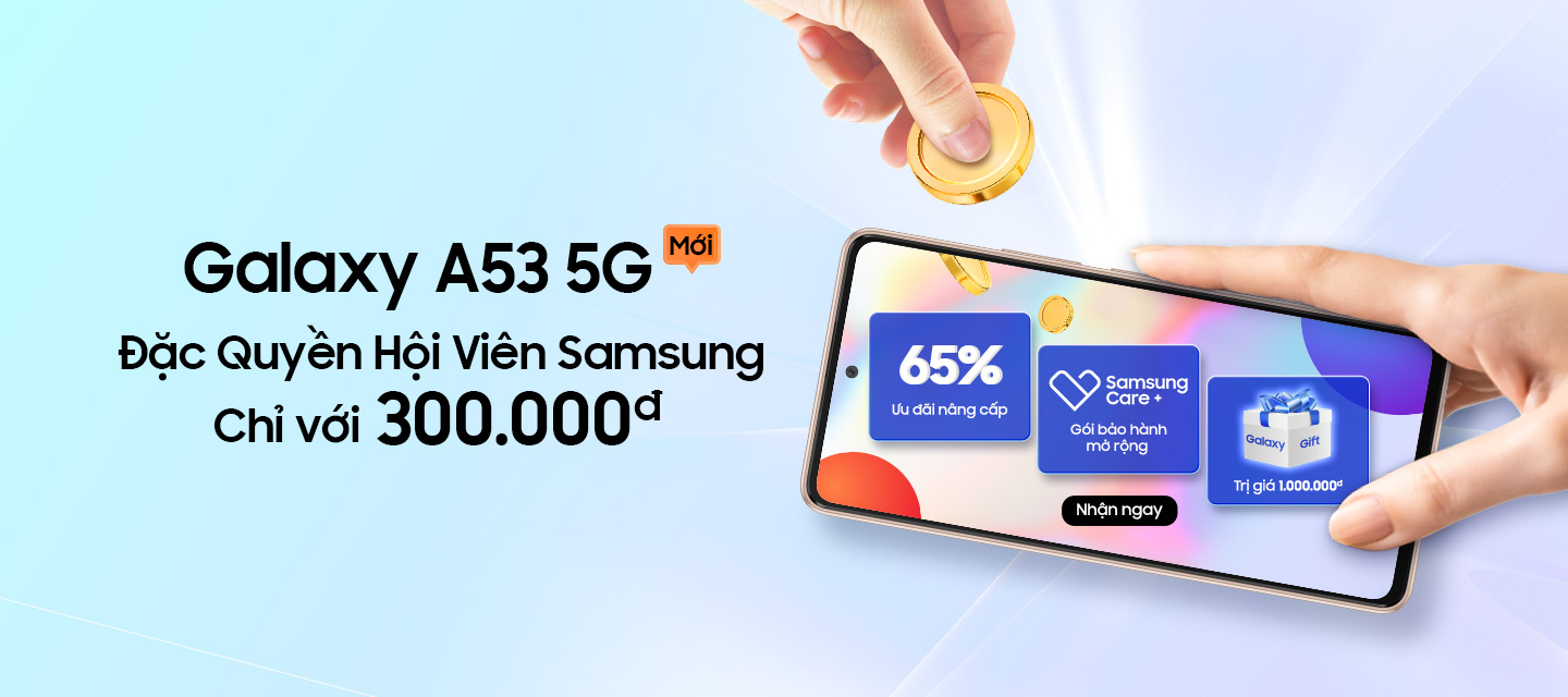 Cách thức tham gia Chương trình Đặc Quyền Nâng CấpBước 1: Người Tiêu Dùng mua sản phẩm Galaxy A53 5G và được giới thiệu về Chương trình Đặc Quyền Hội Viên. Người tiêu dùng đồng ý với các Điều khoản của Chương trình, thanh toán phí đăng ký hội viên là 300,000đ. Nhân viên ở Đại lý sẽ hỗ trợ khách hàng đăng ký thông tin tham gia trên microsite (*) (Do Samsung phát triển và quản lý)Bước 2: Trong vòng 3 ngày kể từ ngày thành công đăng ký hội viên, Người Tiêu Dùng sẽ nhận được 01 thư điện tử/ tin nhắn xác nhận tham gia chương trình gửi đến email và số điện thoại đã được dùng để đăng kýBước 3: Từ 9 tháng đến 12 tháng kể từ ngày mua máy và kích hoạt bảo hành MCS, Người Tiêu Dùng mang Samsung Galaxy A53 5G đến bất kì chi nhánh nào thuộc Đại lý mà khách hàng đã mua sản phẩm và đăng ký tham gia Chương trình để lựa chon sản phẩm Galaxy mới với giá bán lẻ ngang hoặc cao hơn giá bán lẻ của Galaxy A53 5GBước 4: Đại lý sẽ tiến hành kiểm định máy Galaxy A53 5G và báo lại mức thu mua lên đến 65% giá đã mua tùy vào mức độ nguyên vẹn của máy và thời gian nâng cấp máyBước 5: Người Tiêu Dùng thanh toán phần còn lại của điện thoại Galaxy mới sau khi đã trừ đi khoản thu mua điện thoại Galaxy A53 5G