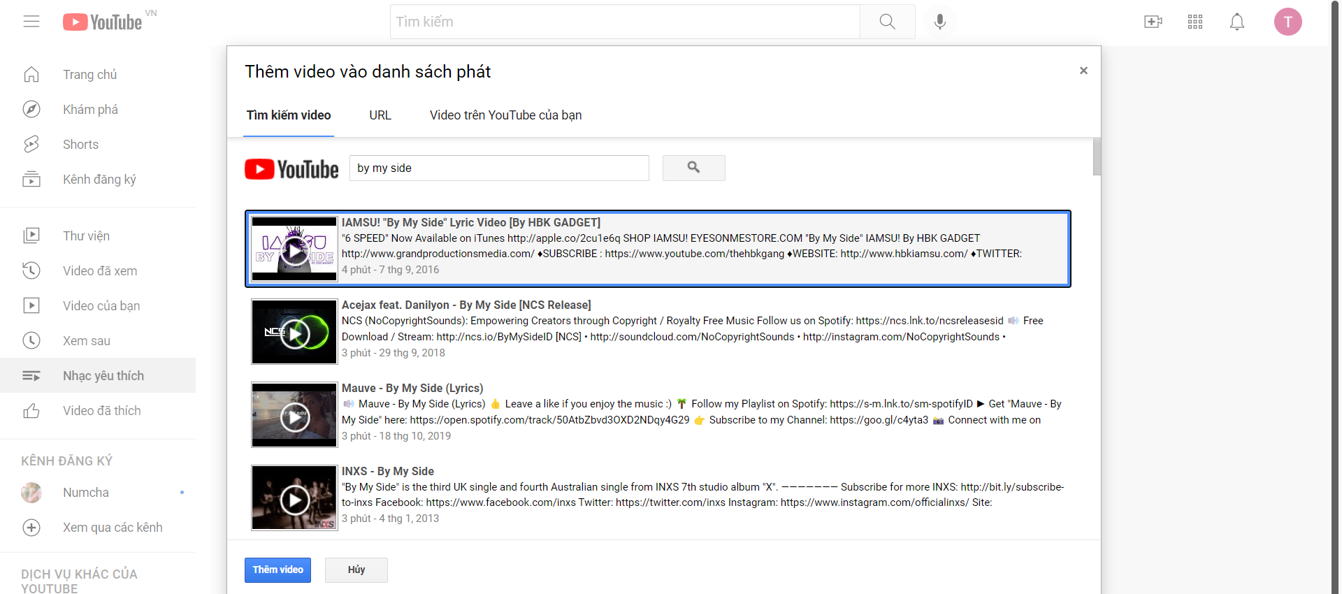 Cách 1: Chọn tìm kiếm video, sau đó gõ tên video bạn muốn thêm để tìm kiếm. Kết quả tìm kiếm hiện ra, click vào video đó, chọn “thêm video”.
