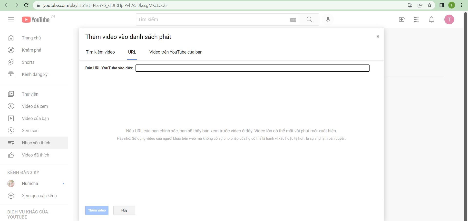 Cách 2: Chọn URL/ dán URL Youtube vào đây/ click thêm video.