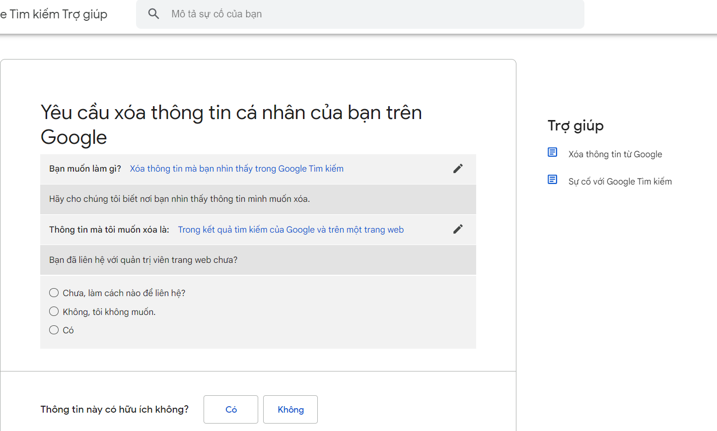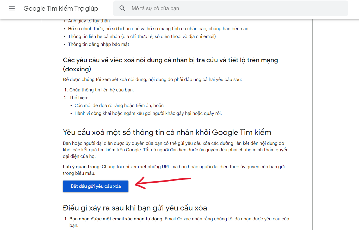 Yêu cầu thủ côngBạn có thể truy cập vào trang Trợ giúp Tìm kiếm của Google, tóm tắt các tuỳ chọn ở trên hiển thị liên kết trực tiếp đến biểu mẫu này: yêu cầu xoá thông tin cá nhân của bạn trên Google.