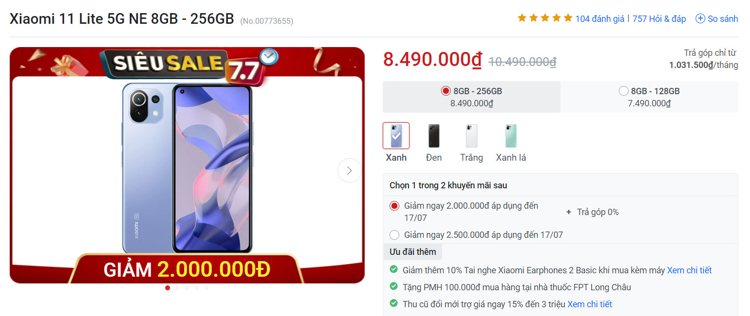 Giá Xiaomi 11 Lite 5G NE tháng 7/2022