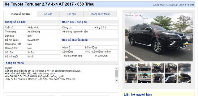 Trong khi đó, phiên bản cao nhất 2.7V 4x4 AT của Toyota Fortuner 2017 đã chạy được khoảng 6 vạn km được đại lý rao giá 850 triệu đồng. Nếu là xe mới, phiên bản này có giá bán niêm yết là 1,308 tỷ đồng.