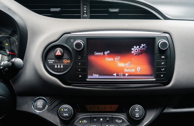 Về nội thất, xe có thiết kế khoang lái đơn giản, mang đến cảm giác rộng rãi, vô lăng 3 chấu bọc da tích hợp các nút rảnh tay. Yaris Pháp được trang bị màn hình giải trí trung tâm kích thước 6,1 inch sử dụng hệ thống đa phương tiện Toyota Touch 2, cho phép kết nối Bluetooth, DVD, AM/FM, USB, AUX và nhận dạng giọng nói.