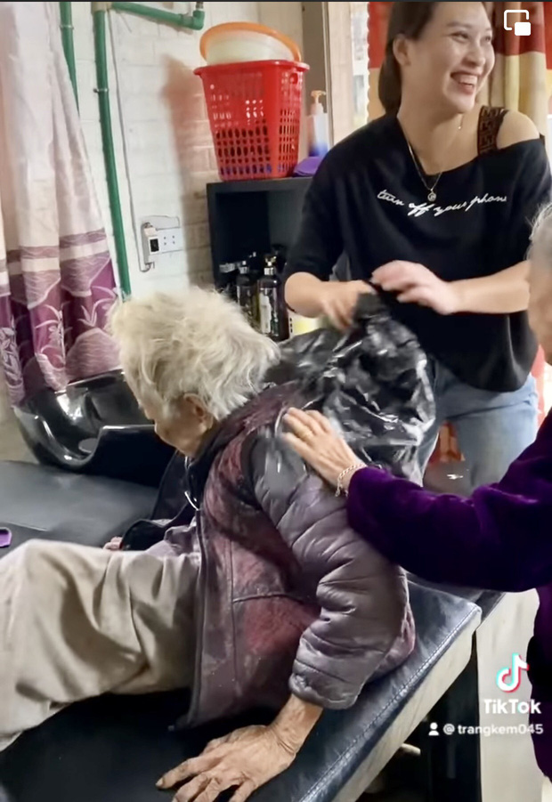 Chị chủ quán cũng rất tốt bụng, thấy hai cụ bà dìu nhau đi thương quá nên gội miễn phí, không lấy tiền của bà luôn" - Chủ nhân đoạn clip kể lại.
