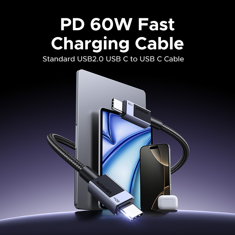 Cáp sạc nhanh UGREEN USB-C to USB-C PD60W hỗ trợ công suất sạc tối đa 60 W và dòng điện 3 A, phù hợp cho hầu hết thiết bị di động và máy tính bảng hiện nay, từ iPhone 16 Pro Max, Samsung Galaxy S24 Ultra đến MacBook Air hoặc Xiaomi. Cáp còn hỗ trợ truyền dữ liệu tốc độ 480 Mbps, đáp ứng nhu cầu sao chép tệp và sạc cùng lúc.