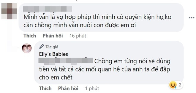 "10 năm cho 1 cuộc hôn nhân ko phải là ngắn. Ko người phụ nữ nào ko toàn tâm toàn ý với cuộc hôn nhân đó mà ở nhà suốt 3 năm sinh 2 đứa nhỏ khi công việc đang trên đà thăng tiến. Chồng hợp pháp của tôi ép buộc tôi phải cho Cadie và Alfie gặp và ngủ qua đêm cùng với nhân tình của anh ta, nếu không anh ta sẽ không đóng tiền học cho 2 đứa. Cái chuyện vô nhân tính như vậy mà họ cũng dám làm. Ba mẹ con mình phải làm sao đây các mẹ". - Elly Trần chua xót nói ra sự thật.