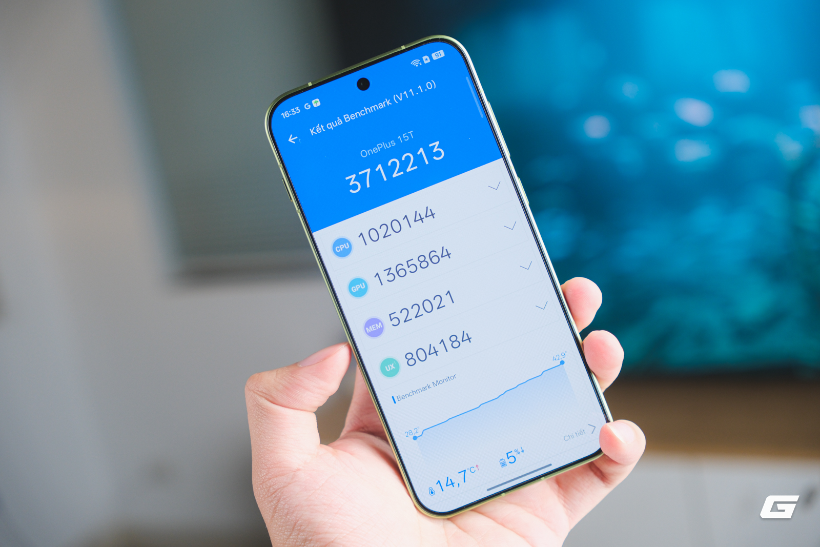 OnePlus 15T chạy Snapdragon 8 Elite Gen 5 (3 nm), RAM LPDDR5X Ultra Pro tối đa 16 GB, bộ nhớ UFS 4.1 tối đa 1 TB. Điểm AnTuTu V11 đạt khoảng 4.175.073 (bản retail, theo đánh giá của Tencent News) đến 4.455.423 (bản pre-launch trên Weibo chính thức của AnTuTu). Con số này vượt mức trung bình 3.839.169 của OnePlus 15 trên bảng xếp hạng AnTuTu tháng 2/2026. Thực tế chúng tôi test được khoảng 3,7 triệu điểm.