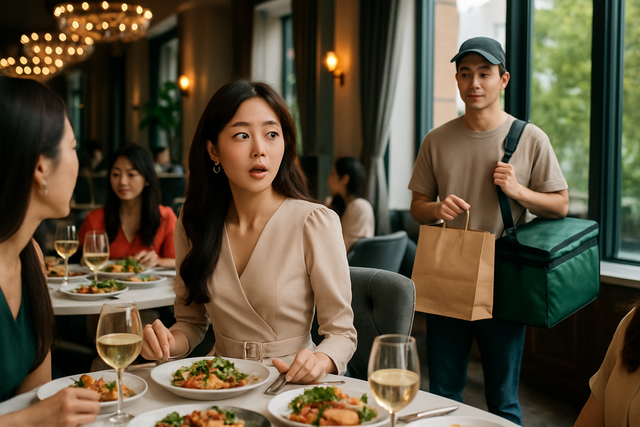 Khi đang trò chuyện, tôi bỗng thấy một bóng dáng quen quen ở quầy nhận đồ trước cửa nhà hàng. Người đàn ông mặc áo khoác shipper, đội mũ lưỡi trai cúi đầu. Tôi thoáng giật mình, dáng người, dáng đi ấy... rất giống chồng tôi. Tôi dụi mắt nhìn kỹ, và đúng thật, đó là anh. Tim tôi khựng lại, tay run run đặt ly nước xuống bàn.