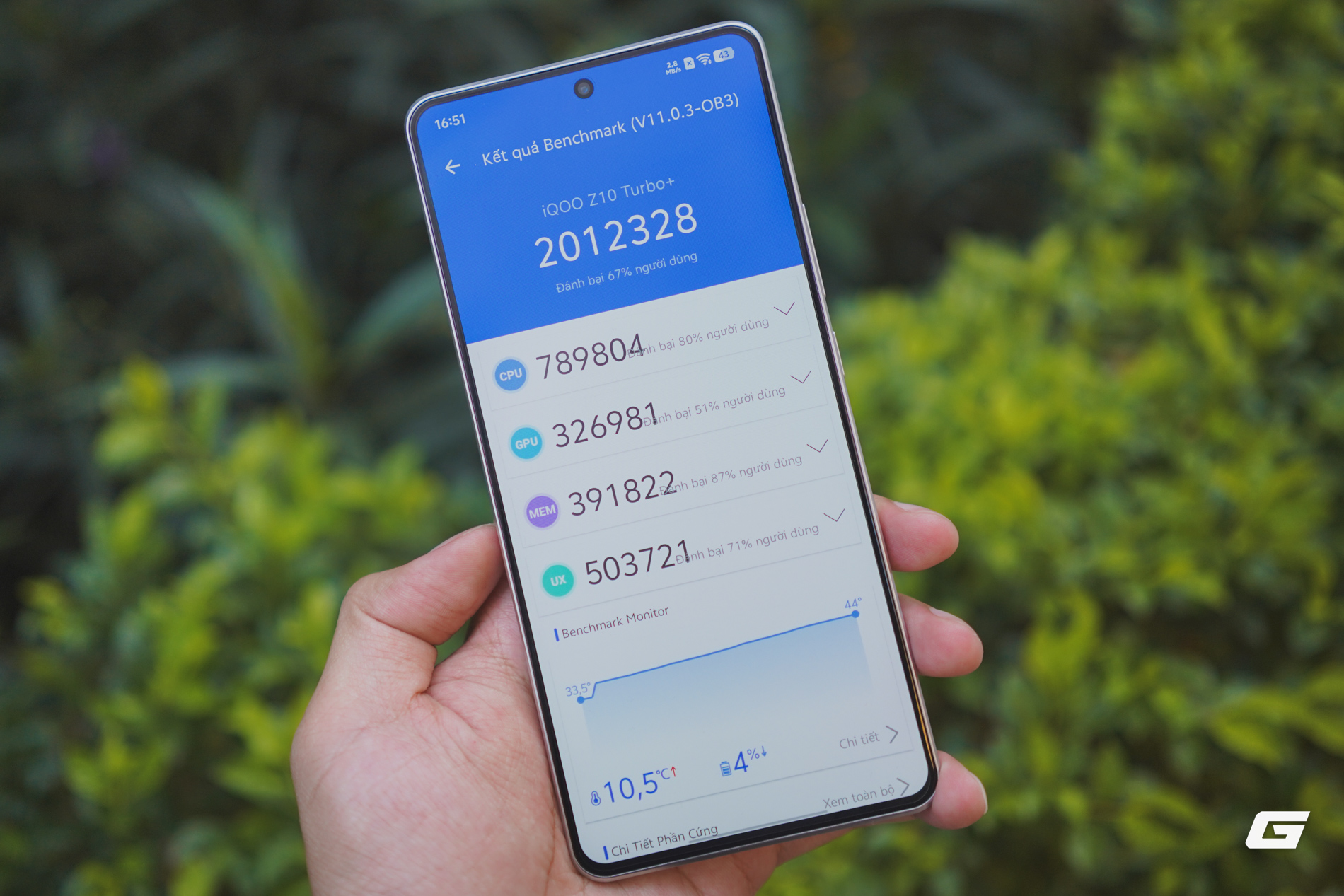 Về hiệu năng, như đã đề cập, iQOO Z10 Turbo+ sở hữu hiệu năng mạnh mẽ trong phân khúc nhờ chip xử lý Dimensity 9400+, con chip flagship của MediaTek ra mắt hồi đầu năm nay. Tính tới thời điểm hiện tại thì nó vẫn cho một sức mạnh cực kỳ mạnh mẽ và có thể cân mượt mọi tựa game nặng nhẹ trên thị trường