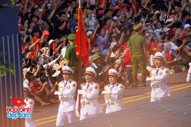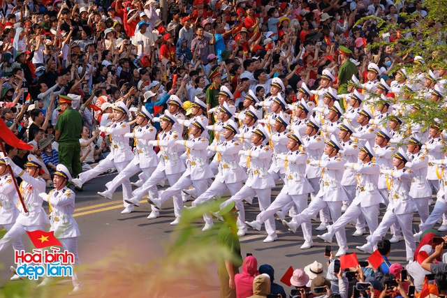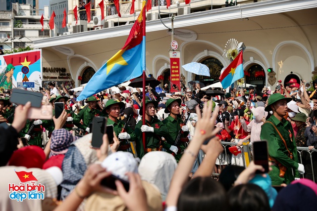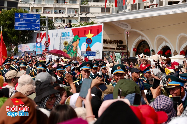 Đoàn diễu binh tiếp tục di chuyển xuống phố đi bộ Lê Lợi, trong tiếng reo hò và những tràng pháo tay vang dội từ hai bên đường. Các chiến sĩ sải bước đều tắp giữa vòng tay thân thiện của người dân, tạo nên hình ảnh gần gũi, xúc động trong không khí trang trọng của ngày 30/4.