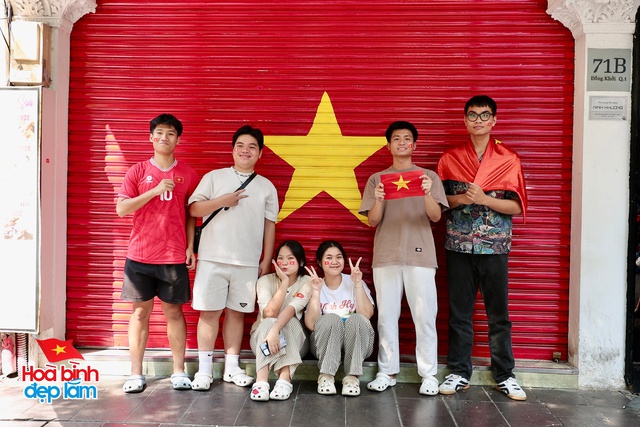 Nhựng bạn trẻ nở nụ cười, liên tục giơ cao chiếc nón và cờ Tổ quốc khi thấy ống kính hướng đến. Ảnh: Hiệu