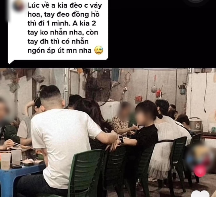 Cụ thể, đoạn clip được ghép từ những bức ảnh chụp không gian quán ăn, trong ảnh là một thanh niên nắm tay cô gái áo đen ngồi cách một ghế, ghế giữa có một cô gái váy hoa đang ngồi. Trong bức ảnh khác, thanh niên choàng tay ôm cô gái váy hoa khá tình cảm. Phía đối diện 3 người này là những bạn bè, người thân khác đang ngồi ăn uống, trò chuyện.