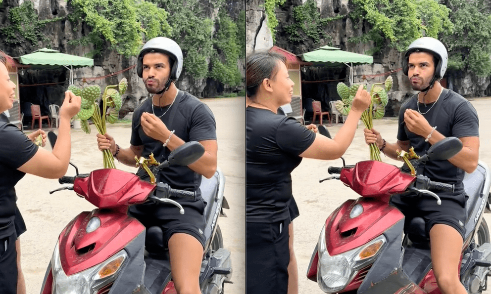 Trong video ngắn được anh chia sẻ, chỉ sau 5 phút đặt chân xuống một khu vực làng quê, anh đã nhận được sự đón tiếp nhiệt tình từ những người dân bản địa. Không cầu kỳ, không sắp đặt, chỉ là khoảnh khắc giản dị khi người dân mời anh ăn hạt sen tươi.