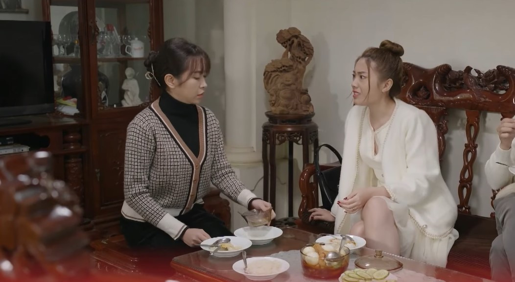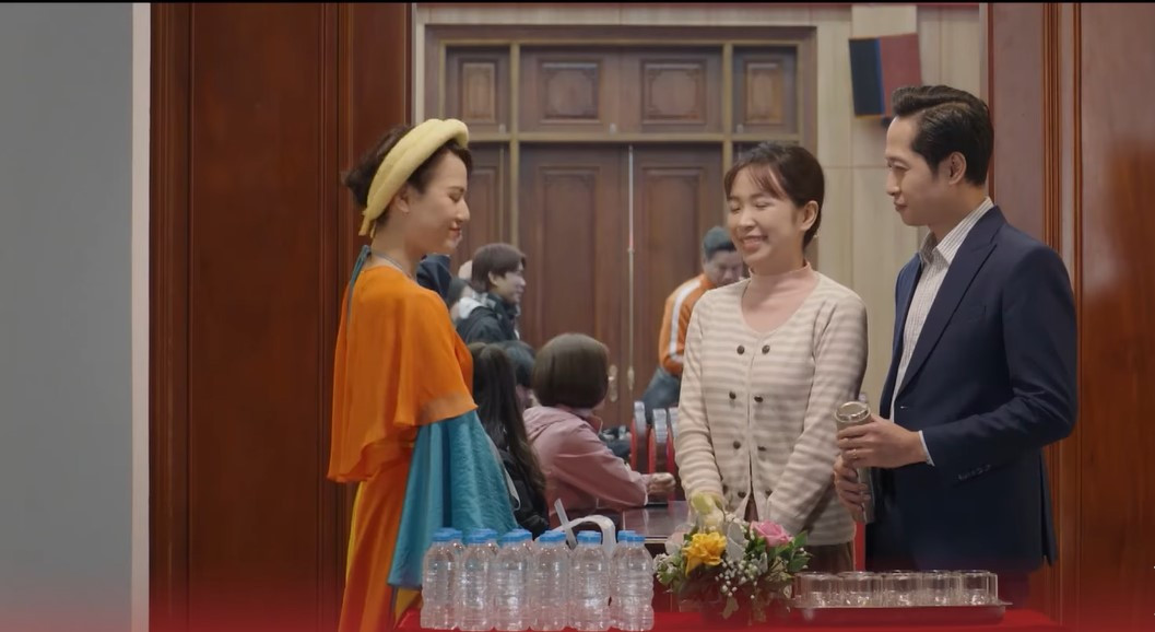"Chồng ơi, anh để quên bình trà nên em mang lên cho anh", Son nói với Đạt. Lúc này, Đạt giới thiệu Son và Thu Hồng với nhau.