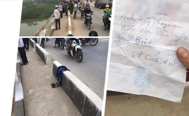 Theo đó, vào sáng cùng ngày (14/4), người dân đang lưu thông qua cầu Đô Lương (nằm trên quốc lộ 7A, bắc qua sông Lam, nối 2 xã Lưu Sơn và Đặng Sơn) thì phát hiện đôi dép cùng một mảnh giấy để lại trên cầu với nội dung "Anh L. anh hãy thay em chăm sóc các con nên người... Vợ của anh" kèm theo một số điện thoại.