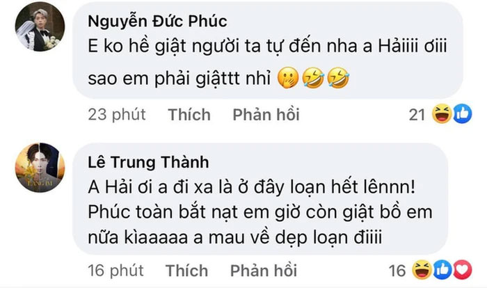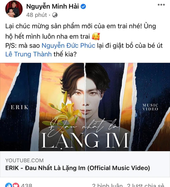 Đáng chú ý, dưới bài đăng của Minh Hải, cả Erik và Đức Phúc đều vui vẻ vào tương tác nhưng bình luận của Erik lại khiến nhiều người băn khoăn, cho rằng nam ca sĩ đang "mách" người anh thân thiết về những gì xảy ra khi anh không ở nhà. Cụ thể, giọng ca sinh năm 1997 viết: "Anh Hải ơi, anh đi xa là ở đây loạn hết lên. Phúc toàn bắt nạt em giờ còn giật bồ em, anh mau về dẹp loạn đi".