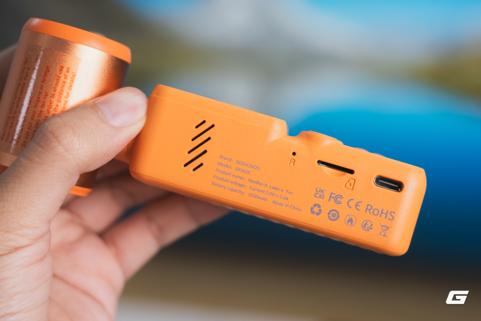 Phần quạt cầm tay là điểm khác biệt khiến GFS025 không giống bất kỳ sản phẩm quay phim nào khác. Hãng công bố 100 cấp độ gió có thể điều chỉnh và tốc độ tối đa khoảng 10 m/s. Pin dung lượng 2500 mAh cho thời gian sử dụng 2 đến 10 tiếng tùy chế độ, sạc đầy trong khoảng 1,5 giờ qua cổng USB-C.