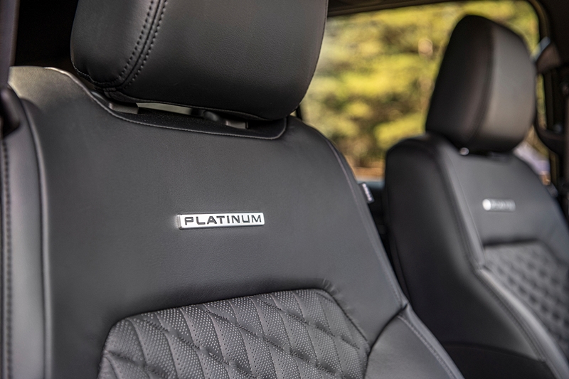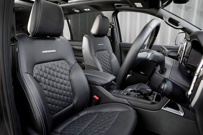 Bên trong cabin xe, đèn nền khu vực được bổ sung. Bọc ghế bằng da màu đen với họa tiết mắt lưới tổ ong đi kèm logo PLATINUM độc quyền. Ghế lái chỉnh điện được nâng cấp từ 8 lên 10 hướng khác nhau, đồng thời giờ trang bị này có khả năng ghi nhớ 3 vị trí ngồi ưa thích nhất của người dùng. Cũng khu vực ghế lái được bổ sung hệ thống thông gió mới.