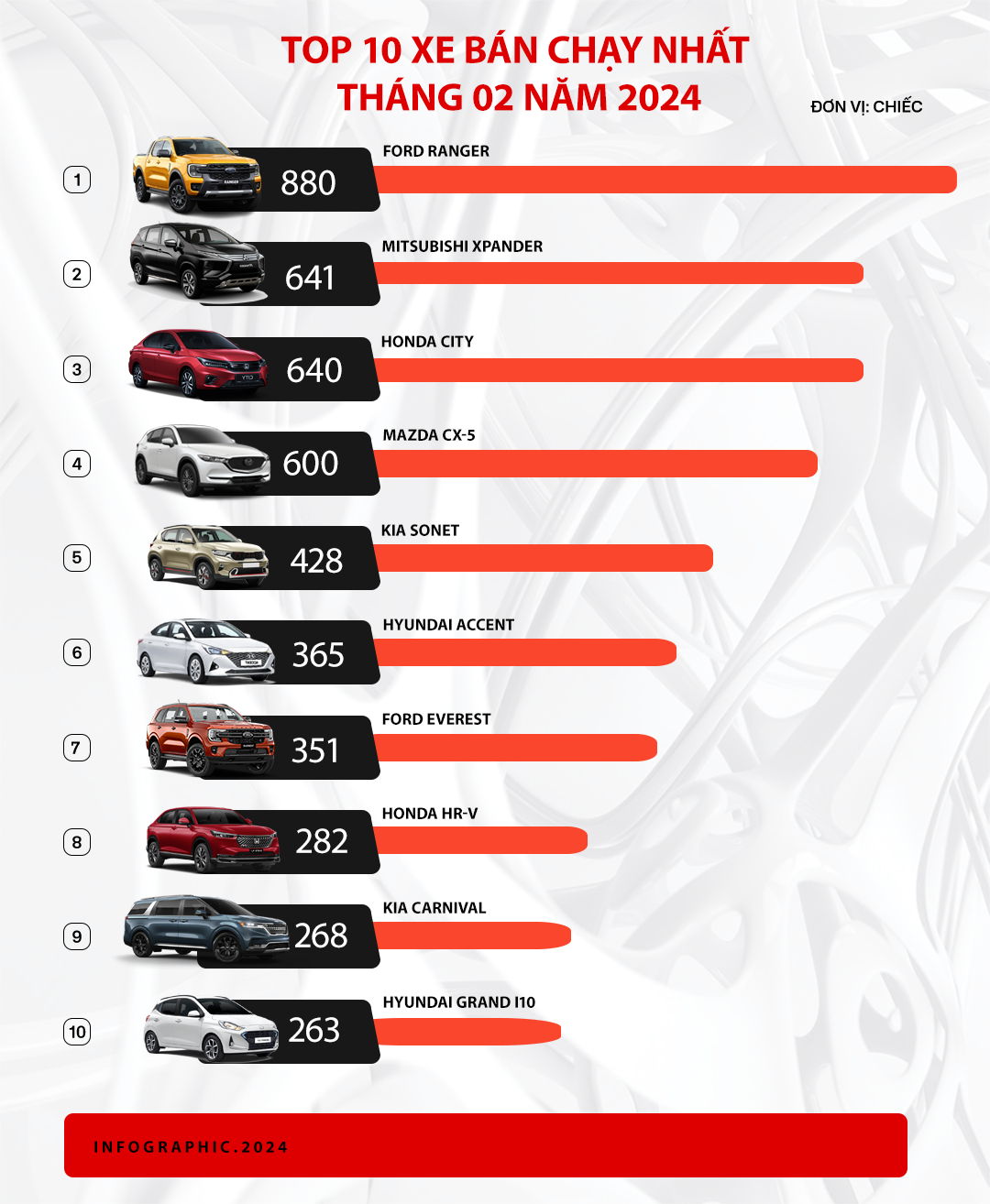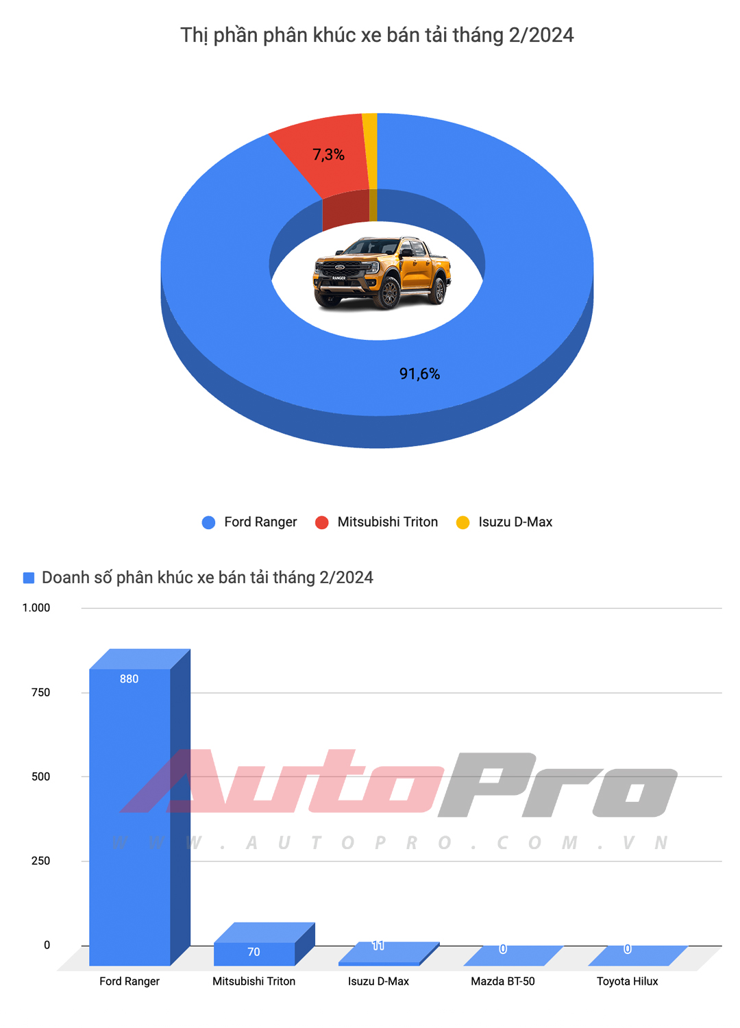 Tháng 2/2024 vừa qua, mẫu bán tải đến từ Mỹ bán được 880 xe, dẫn đầu toàn thị trường về doanh số. Trong phân khúc, Ford Ranger cũng tỏ ra không có đối thủ khi chiếm tới hơn 91% thị phần.