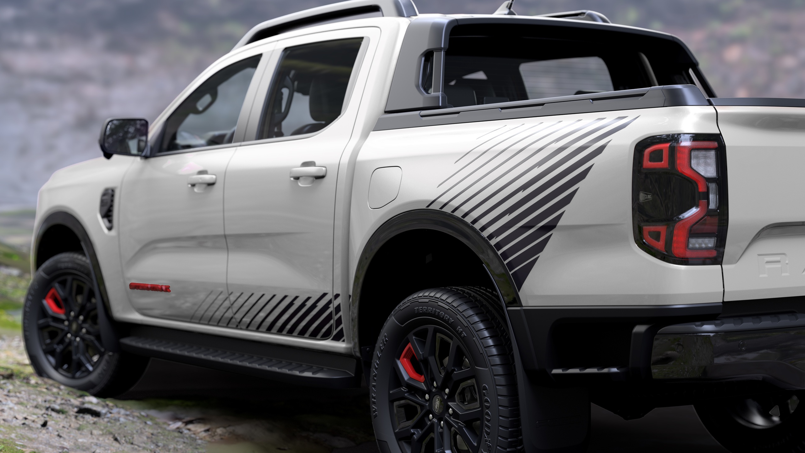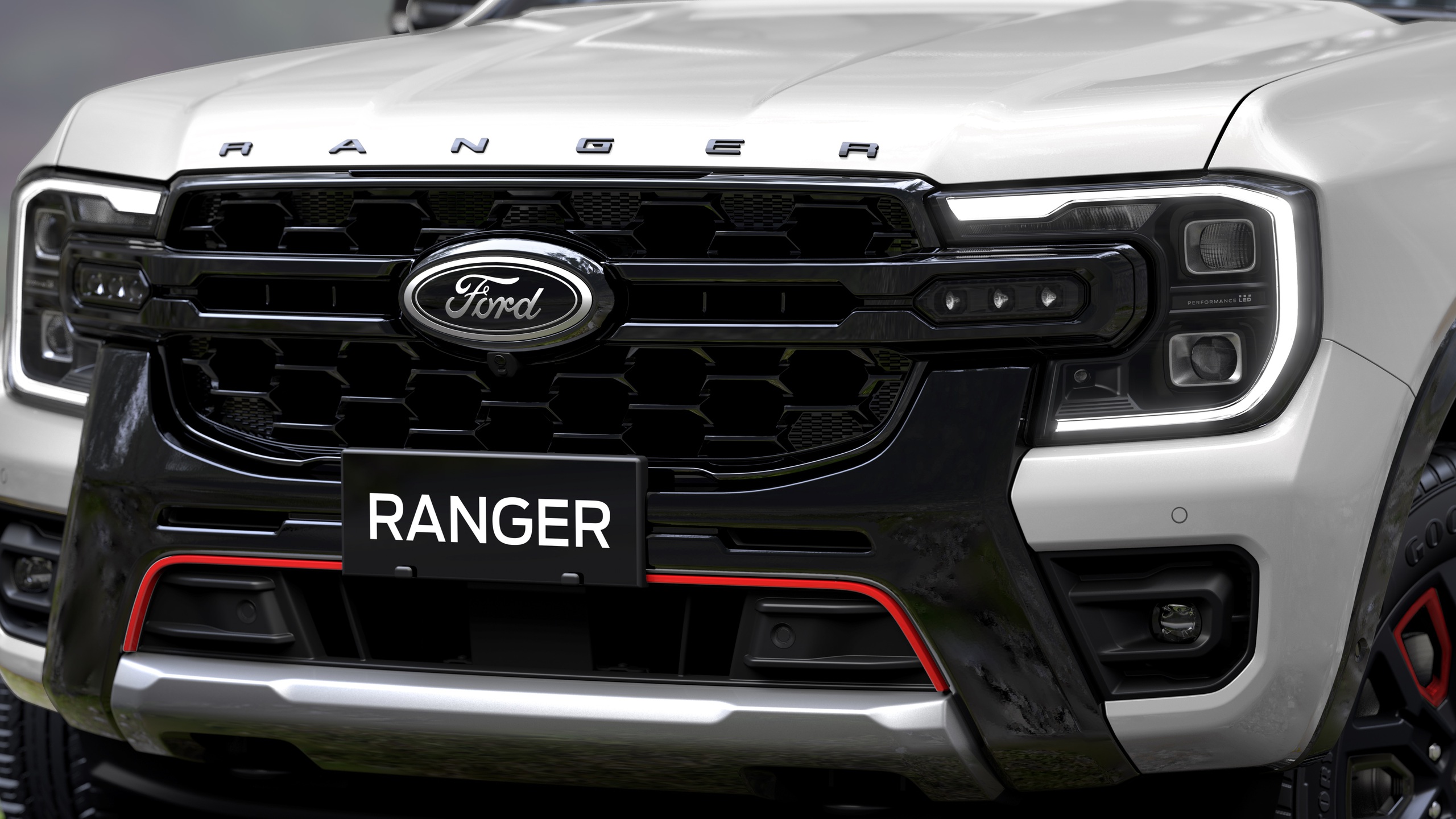 Lưới tản nhiệt thiết kế mới cùng cản trước hình chữ H đen bóng đi cùng đường viền đỏ tạo điểm nhấn. Ford Ranger Stormtrak vẫn được trang bị bộ mâm kích thước 20 inch giống với thị trường Thái Lan.