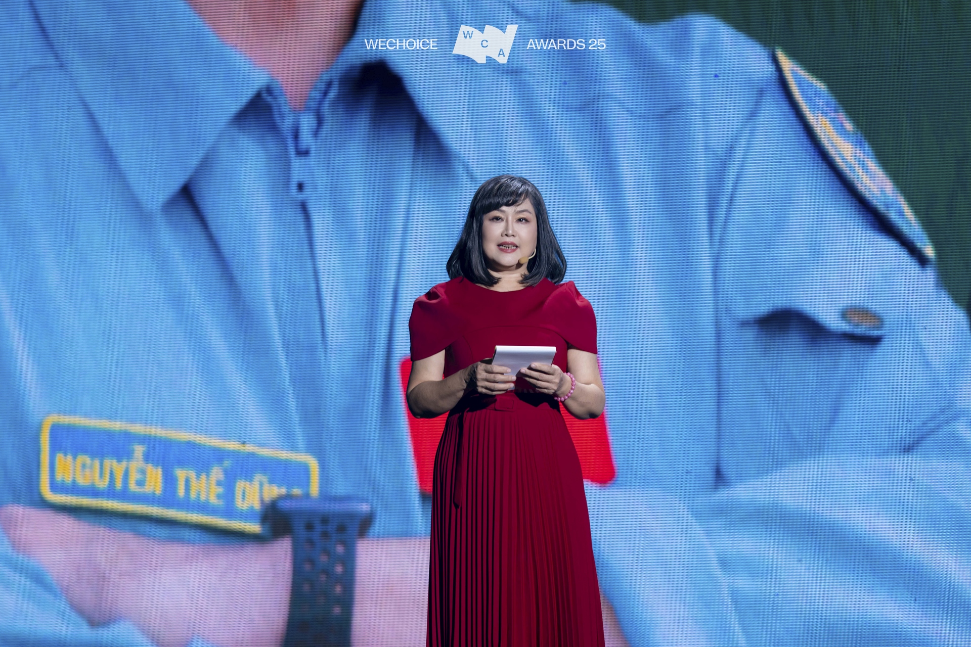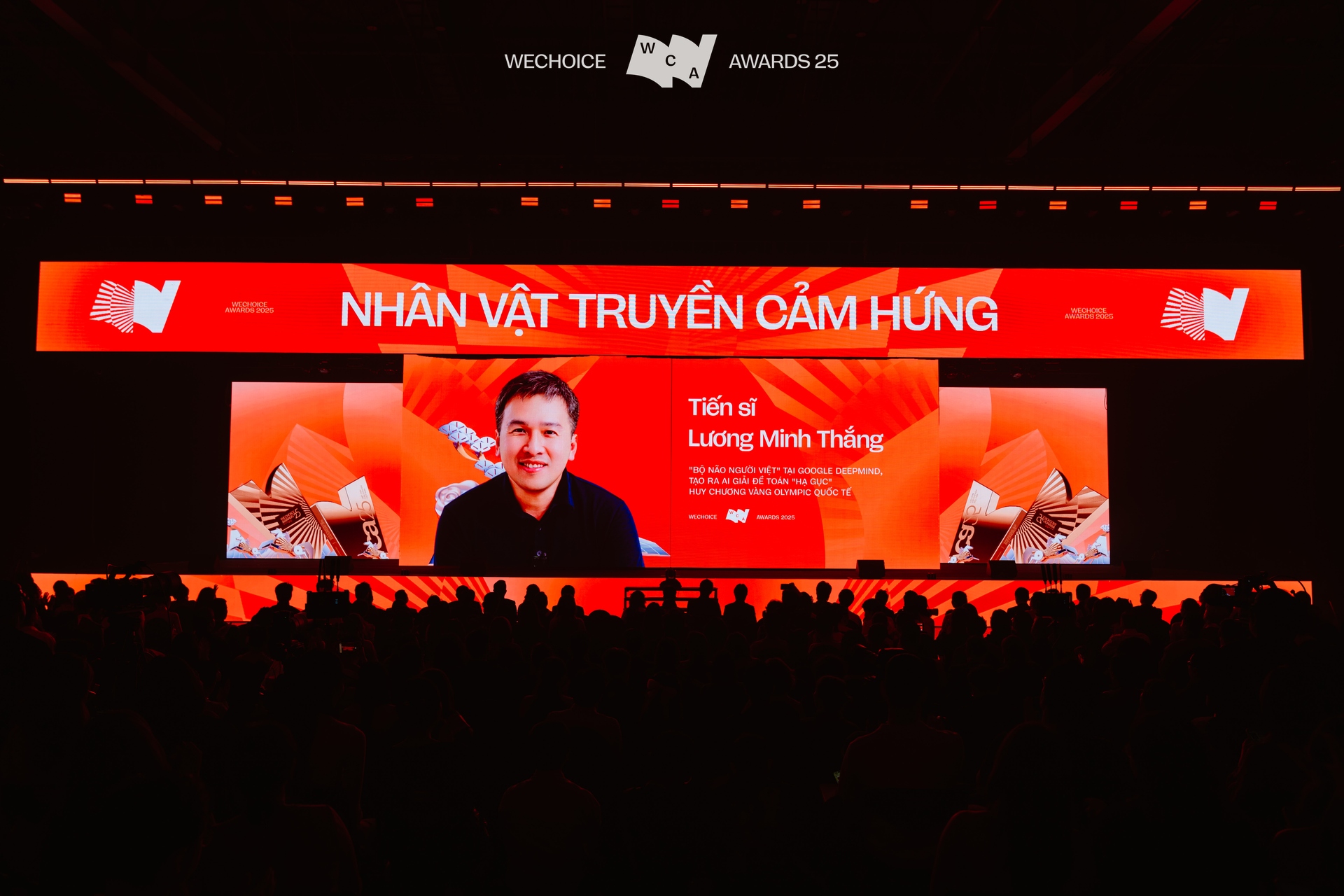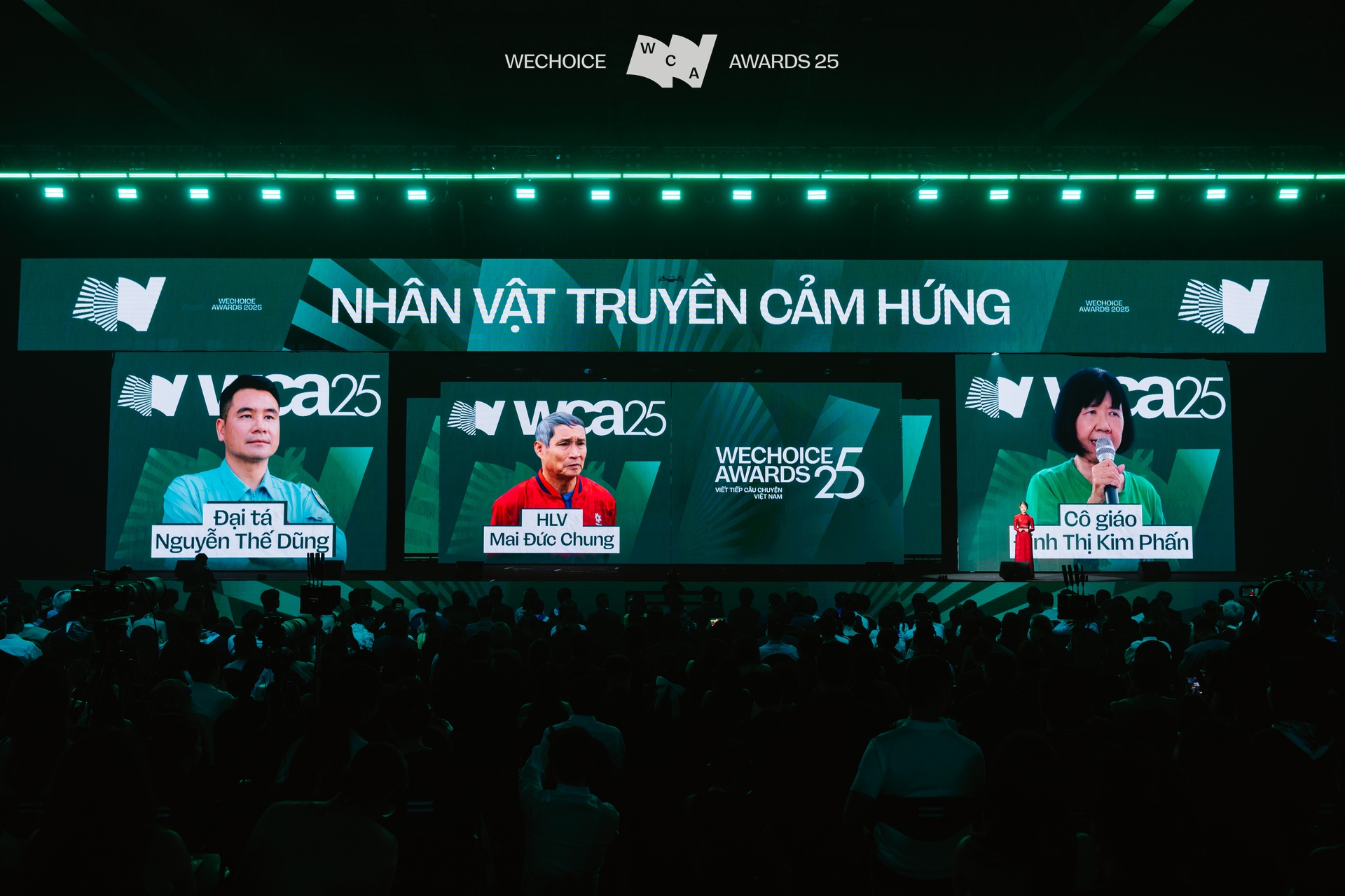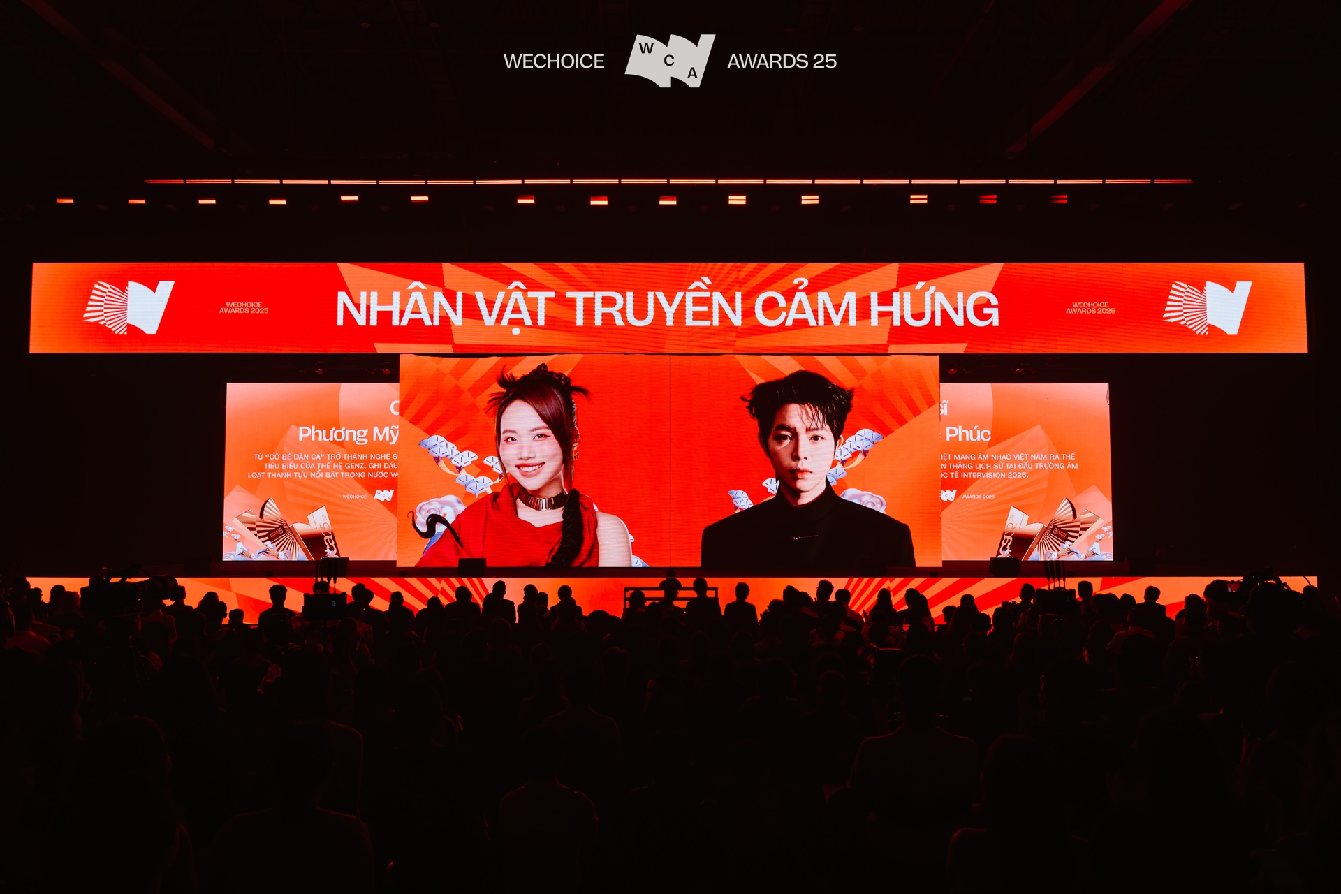 Tại sân khấu của WeChoice Awards 2025, khán giả dành trọn vẹn sự tập trung lên màn hình LED - nơi trình chiếu hành trình lần lượt của 21 nhân vật truyền cảm hứng. Với sự dẫn dắt của Nhà báo Thu Uyên - thành viên Hội đồng Thẩm định cùng MC Khánh Vy, 21 nhân vật truyền cảm hứng mang theo những câu chuyện riêng chính thức xuất hiện trước hàng nghìn khán giả.