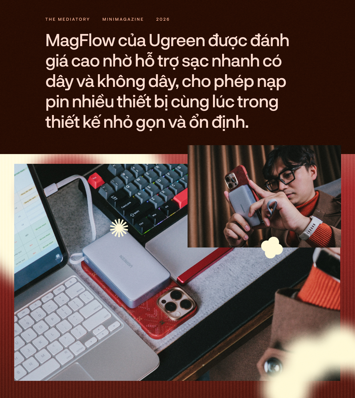 Trong nhóm phụ kiện, sạc dự phòng MagFlow của Ugreen được anh đánh giá cao nhờ khả năng sạc nhanh cả không dây lẫn có dây, hỗ trợ nhiều thiết bị cùng lúc. Thiết kế gọn gàng, độ ổn định khi sạc và mức giá hợp lý trong đợt khuyến mãi là những yếu tố khiến anh hài lòng.