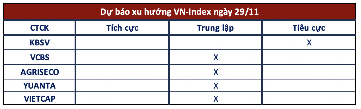 Nhận định về xu hướng phiên giao dịch tiếp theo 29/11, đa phần các CTCK đồng thuận kịch bản VN-Index có thể tiếp tục tích luỹ, nhưng rung lắc vẫn có thể xuất hiện nên nhà đầu tư cần cẩn trọng trong việc mua mới.