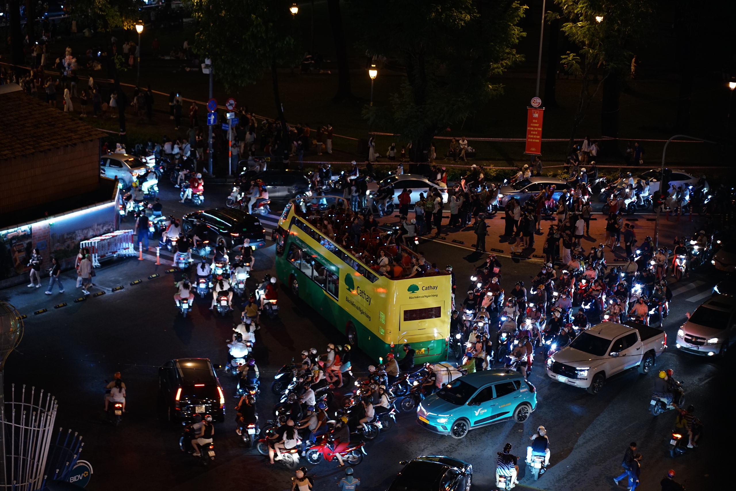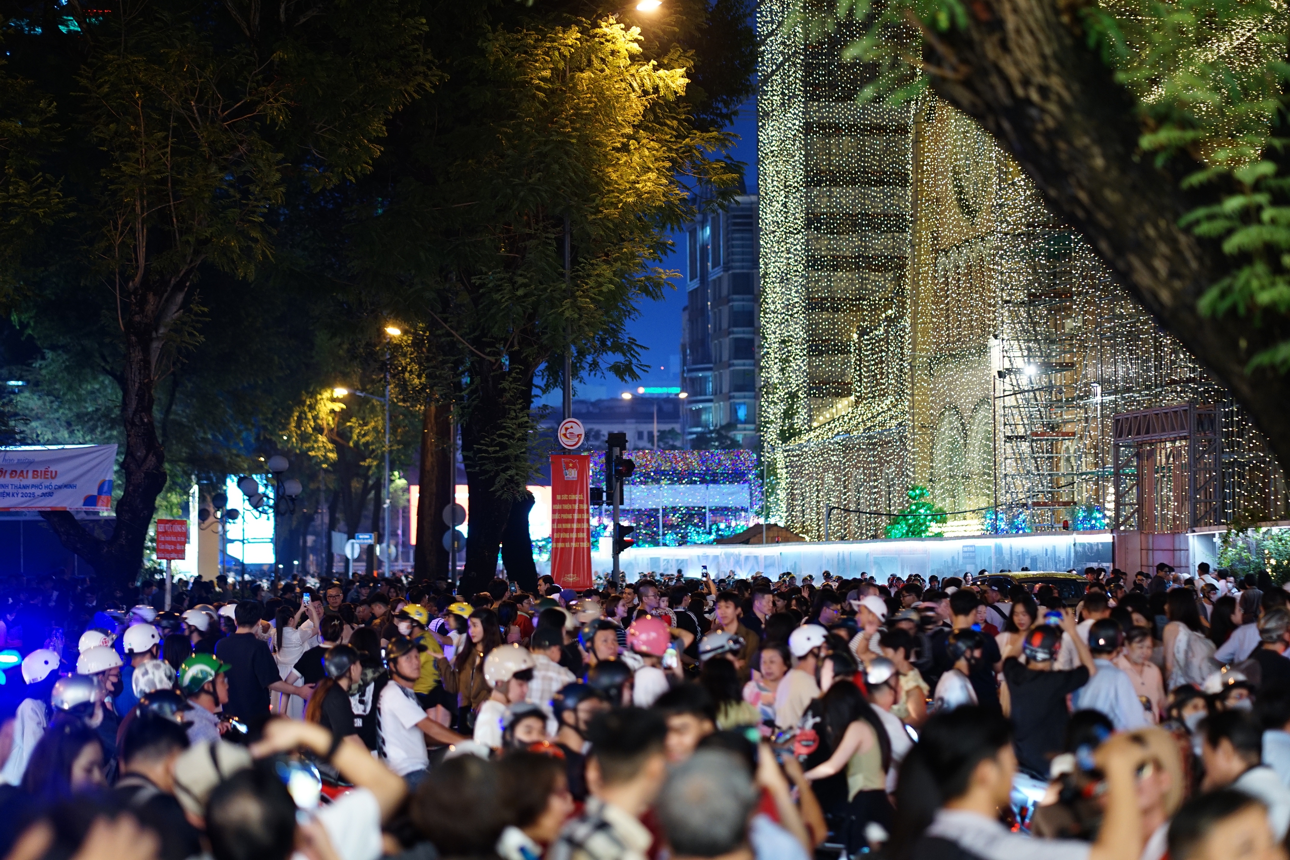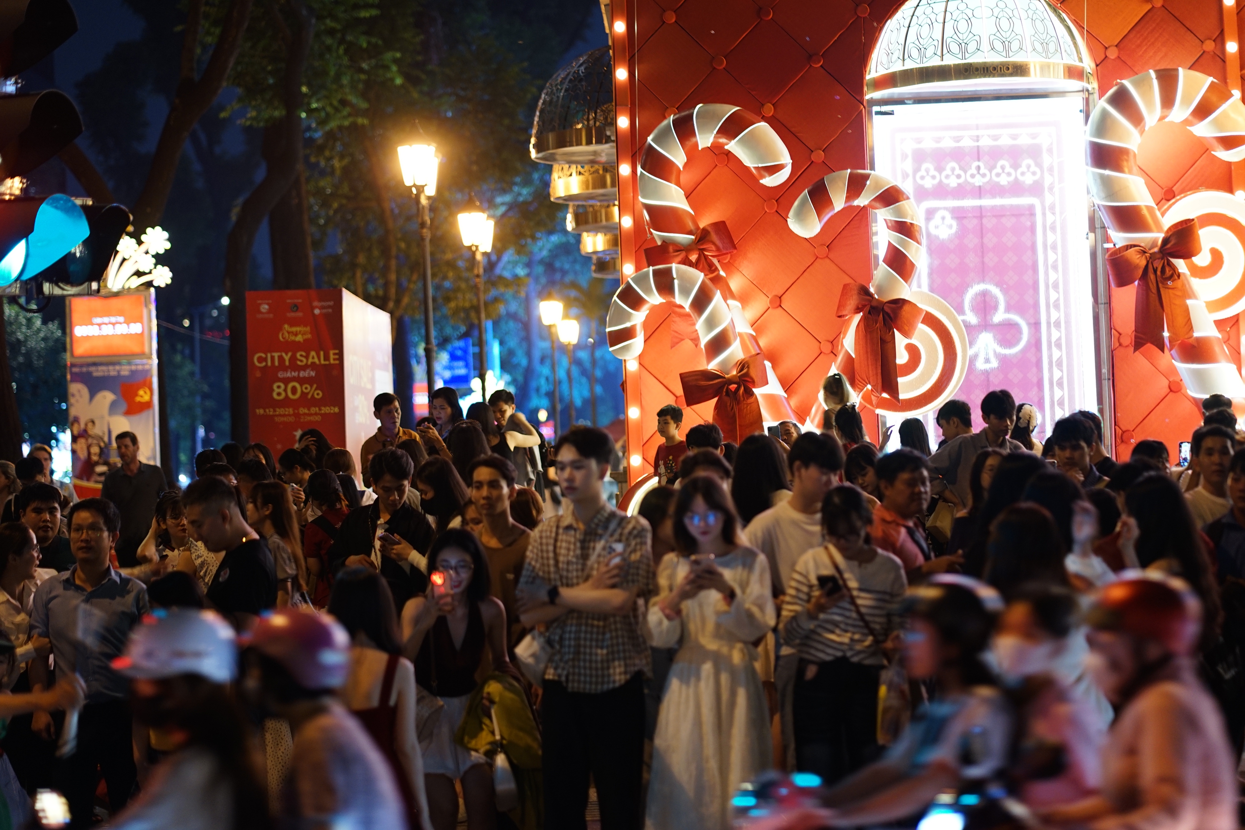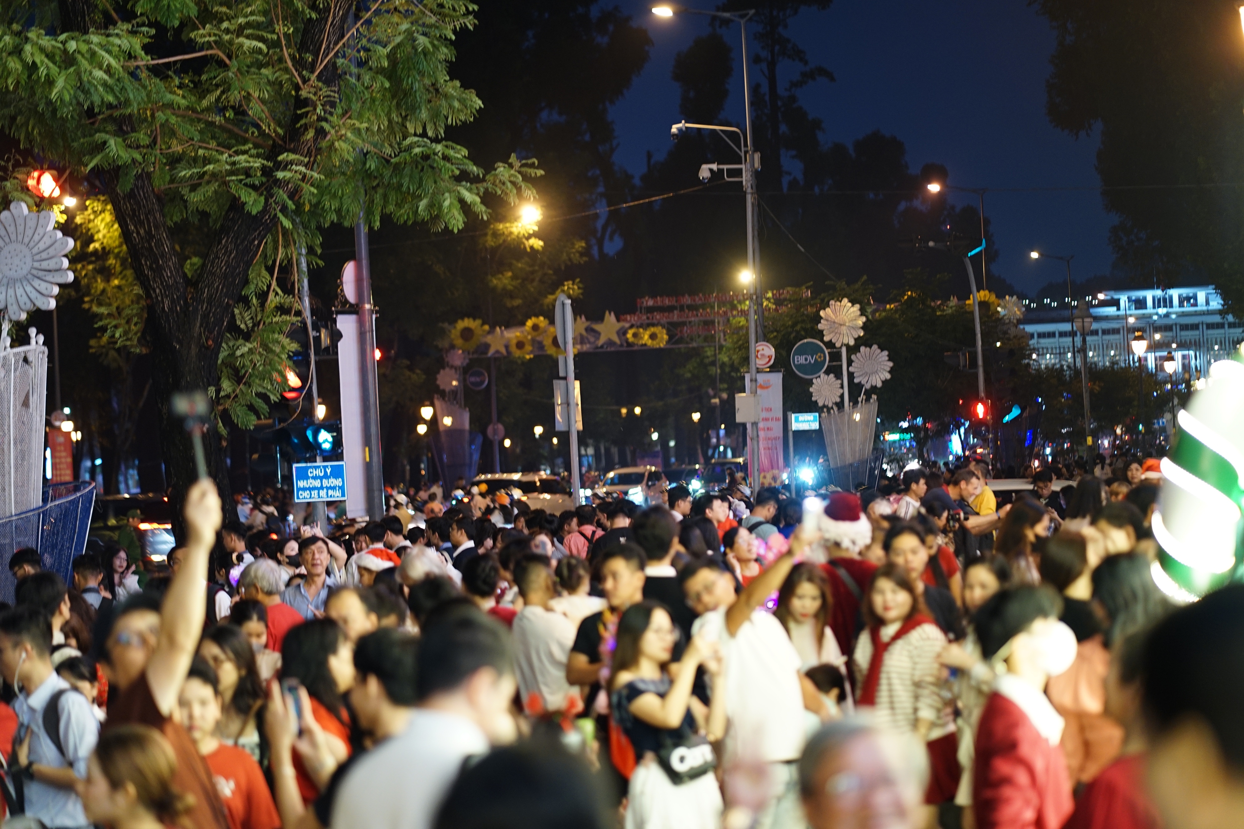 Tại TP.HCM, hàng nghìn người đổ về khu vực trung tâm thành phố, nơi được trang hoàng rực rỡ như Nhà thờ Đức Bà, Diamond Plaza (quận 1) để chào đón Giáng sinh. Từ khoảng 17h, nhiều tuyến đường bắt đầu tắc nghẽn vì lưu lượng xe cộ quá đông.