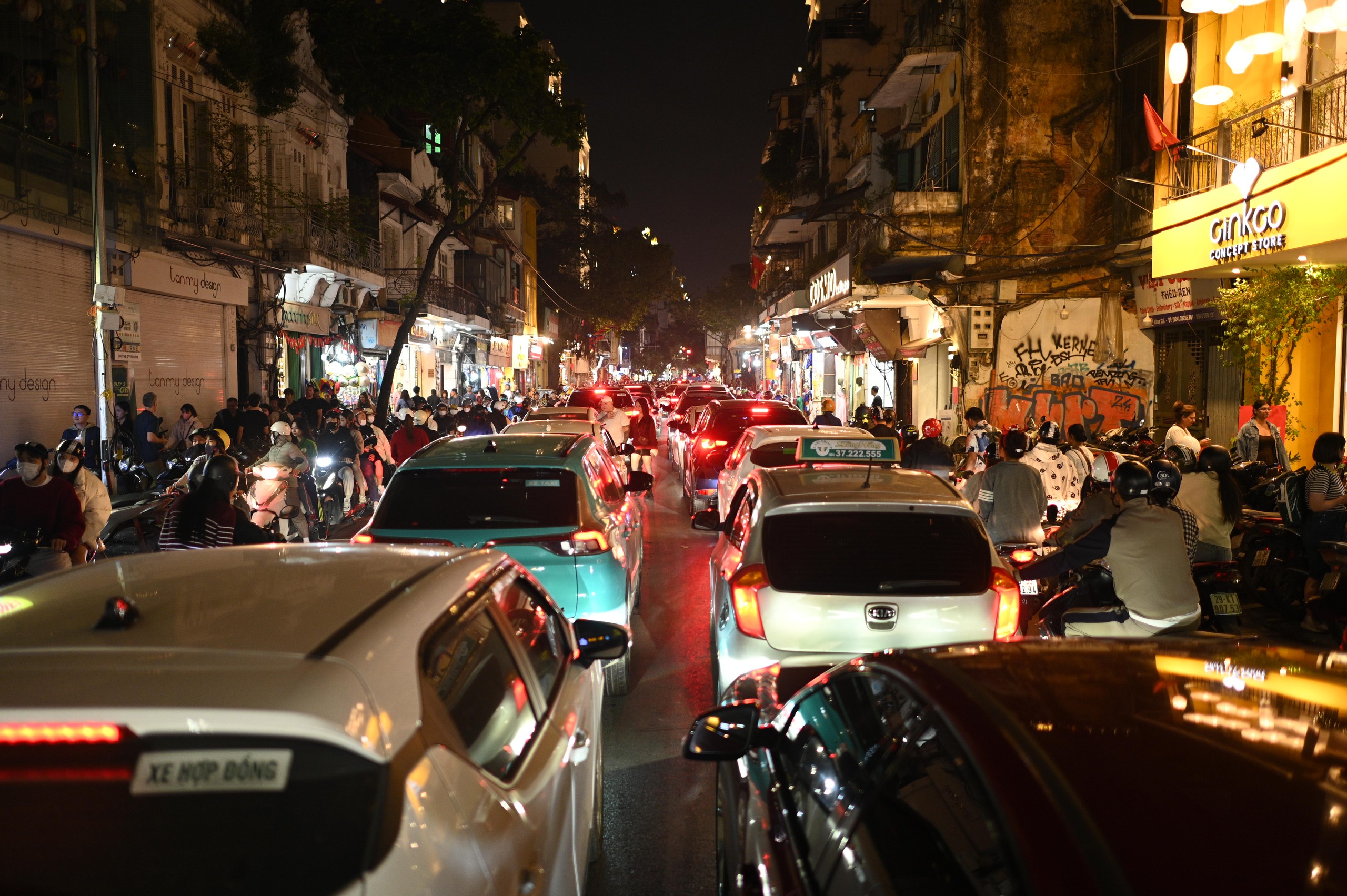 Dòng xe nối dài, di chuyển chậm trên phố khi lượng người đổ về đây mỗi lúc một đông. Ảnh: Quân