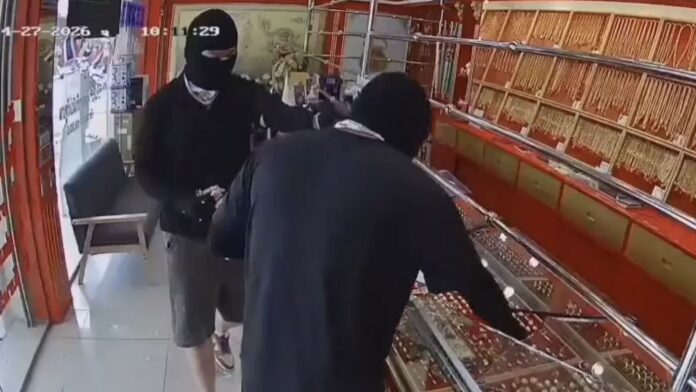 Phát hiện dấu hiệu bất thường, hai nhân viên đã nhanh chóng chạy vào phía sau để tránh nguy hiểm. Không thể tiếp cận khu trưng bày dây chuyền vàng do có lưới bảo vệ, hai nghi phạm đã dùng vật cứng đập vỡ tủ kính chứa nhẫn vàng, rồi nhanh chóng vơ lấy số trang sức trước khi rời khỏi hiện trường. Toàn bộ quá trình chỉ diễn ra trong khoảng 30 giây.