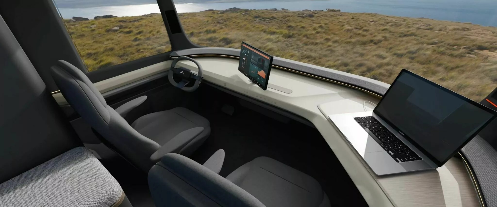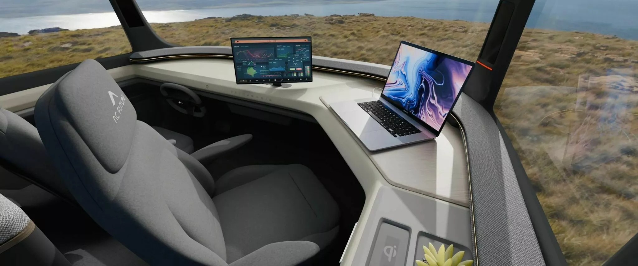 Nội thất AC Future eTH, quan sát qua ảnh, nhìn rất hiện đại, sang trọng và ấm cúng. Xe có các khu vực phòng khách, bếp, phòng ngủ và phòng tắm/vệ sinh tách biệt riêng. Khu vực táp lô xe phía trước có thể chuyển đổi thành bàn làm việc nhờ vô lăng có thể thu gọn và ghế xoay.