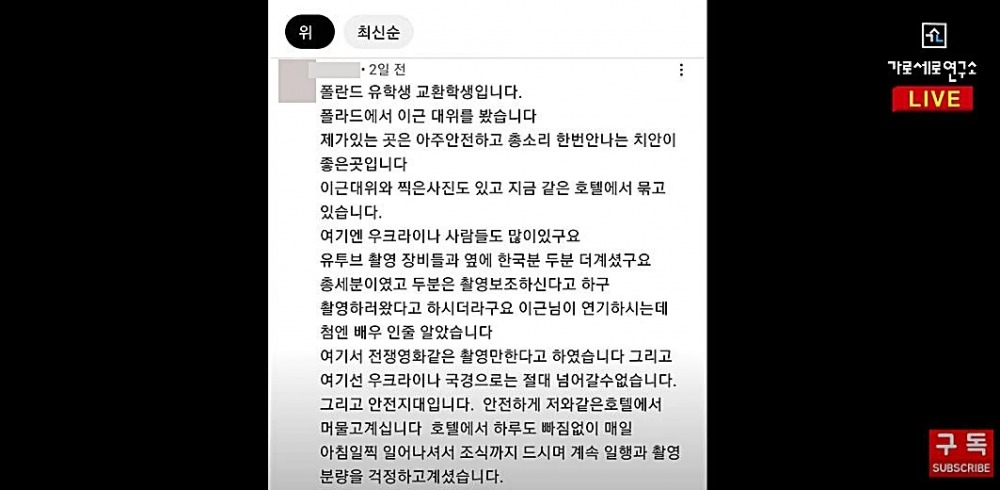 Hôm 22/3 vừa qua, một kênh YouTube nổi tiếng có tên "Garo Sero Institute" đã phát hành một video cho thấy một bình luận của một người có biệt danh là 'A', người tự giới thiệu là một du học sinh ở Ba Lan. 'A' tiết lộ rằng anh ấy đã nhìn thấy Ken Rhee ở Ba Lan và anh ấy đang ở tại một khách sạn. Nhận xét này được đưa ra vào ngày 20 của tháng này.