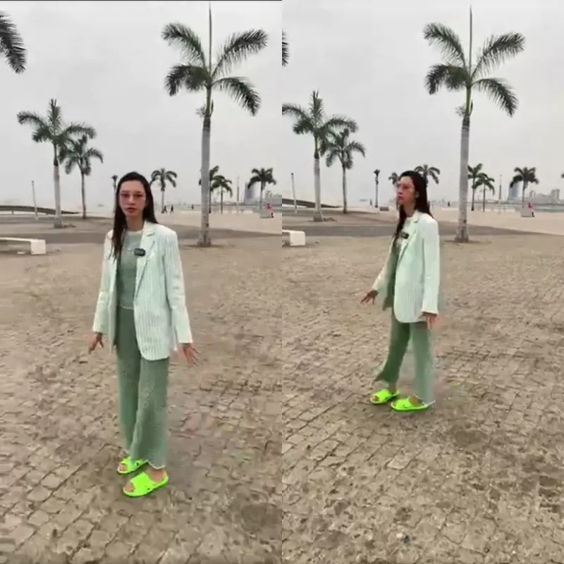 Sự hồn nhiên của người đẹp 24 tuổi còn lên một "level khác" khi camera lia xuống chân. Thùy Tiên đi một đôi dép tổ ong màu xanh chói lóa, không mấy ăn nhập với bộ trang phục lịch sự.