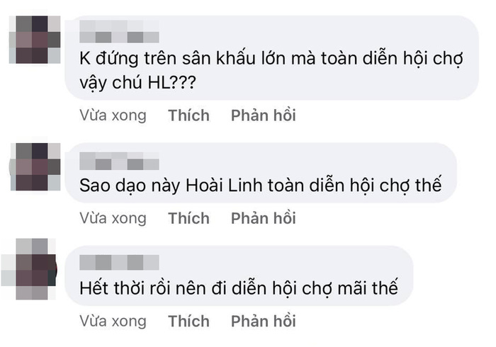- "Sao không đứng trên sân khấu lớn mà toàn diễn hội chợ vậy chú Hoài Linh?".