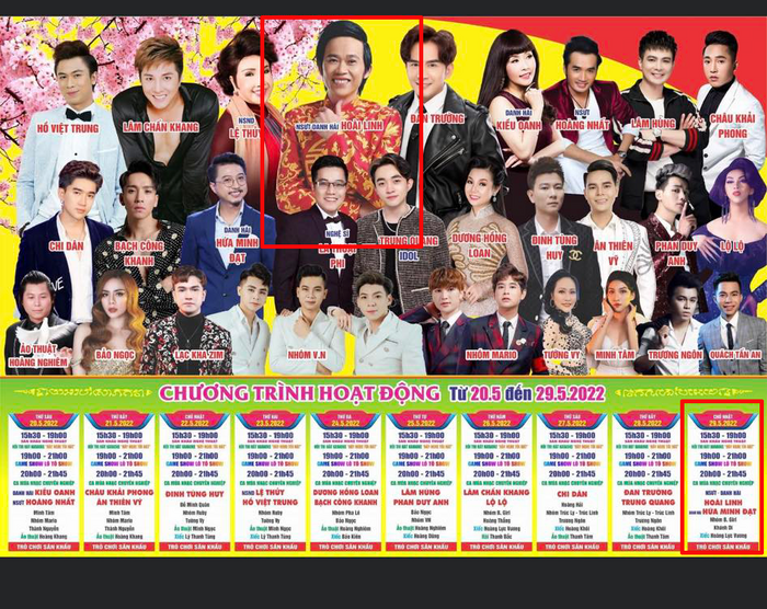 Trong tấm poster được chia sẻ, hình ảnh Hoài Linh được xuất hiện ở vị trí đẹp nhất - đại diện cho nhân vật quan trọng nhất của đêm diễn. Đây là lần thứ hai Hoài Linh xuất hiện trên một sân khấu hội chợ hậu ồn ào từ thiện. Điều này khiến không ít người thắc mắc, cho rằng Hoài Linh đã hết thời nên phải quay trở lại nghệ thuật bằng sân khấu hội chợ.
