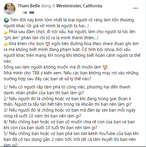 Khá khen cho bọn ngồi bên đường hùa theo chia sẻ đoạn ghi âm ra mà không biết mình đang phạm luật. Cố tình bôi nhoạ, bôi xấu người khác trên mạng xã hội trong khi không biết hoàn cảnh người ta thế nào. Sống sao làm người không muốn mà đi muốn làm".