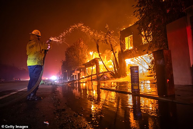 Một lính cứu hỏa đang chiến đấu với đám cháy tại Palisades