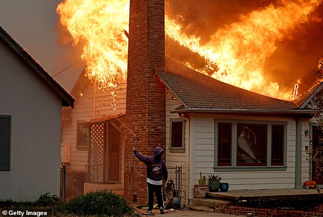 Một người dân đang dùng vòi xịt trong nhà để chữa cháy
