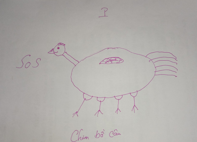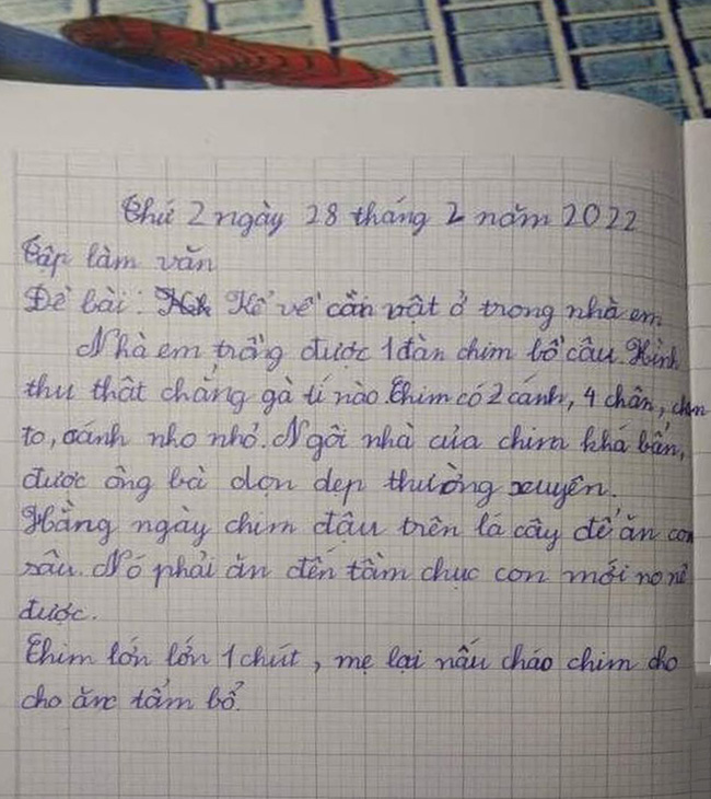 Em học sinh viết: "Nhà em trồng được 1 đàn bồ câu. Hình thù thật chẳng gà tí nào. Chim có 2 cánh, 4 chân to, cánh nho nhỏ. Ngôi nhà của chim khá bẩn được ông bà dọn dẹp thường xuyên. Hằng ngày chim đậu trên lá cây để ăn con sâu. Nó phải ăn đến tầm chục con mới no nê được. Chim lớn lớn 1 chút, mẹ lại nấu cháo chim cho em ăn tẩm bổ".