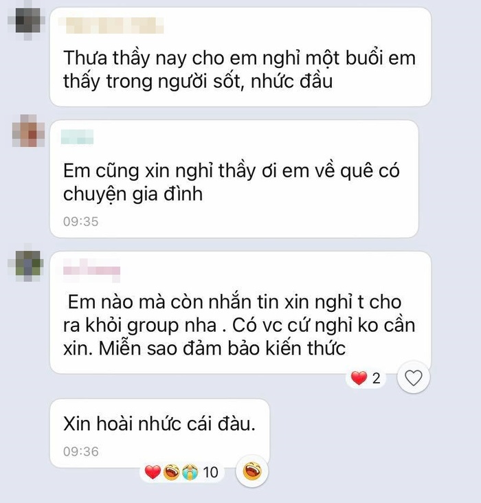 Theo đó, một vài bạn nhắn tin vào nhóm chat của lớp xin nghỉ buổi học vì lý do sức khỏe.