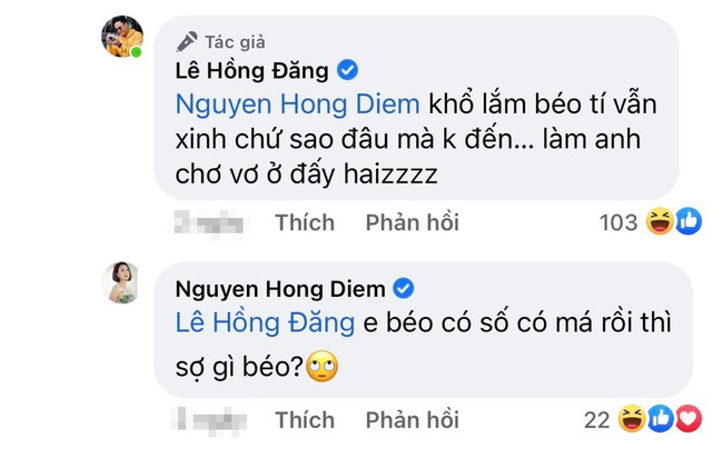 Hồng Diễm đáp lại 'người tình màn ảnh': "Em béo có số có má rồi thì sợ gì béo?". Tiếp đó, Hồng Đăng ngậm ngùi bình luận: "Thế hà cớ gì em không đến? Để mọi người có đôi có cặp hát hò... mình anh lang thang hết bàn nọ sang bàn kia... nhìn tủi thân phát khóc!".