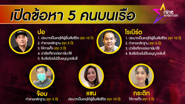 Đến nay, cả 5 đối tượng đi cùng thuyền với Tangmo Nida đều đã bị cơ quan công tố kết tội. Cụ thể các tội danh như sau: