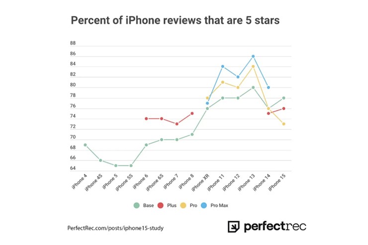 Điểm số 5 sao cho các mẫu iPhone trong những năm qua được PerfectRec khảo sát.